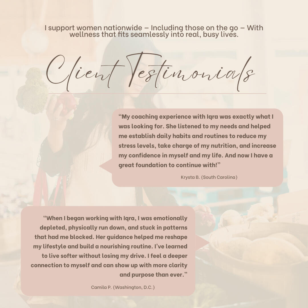Iqra Chaudry works with high-achieving women who are ready to feel steady, energized, and grounded in their bodies without sacrificing their drive or ambition. Her work is designed for women who lead, decide, and hold responsibility well, yet feel the cost of constant output in their focus and energy.Iqra has worked with women who successfully run companies, teams, and families, yet feel disconnected from their internal cues. They’ve been managing too much from the top down, without support for the systems that sustain them on the daily.Her training spans a Master’s in Executive Coaching and Organizational Psychology at Columbia University, Integrative Nutritional Coaching through the Institute for Integrative Nutrition, Yoga Physiology as a Registered Yoga Teacher, and Certification in Advanced Somatic Healing and Embodiment Modalities. This combination allows her to bridge evidence-based science with deep body awareness, translating complex systems into real-time support for women navigating demanding lives.Her approach integrates women’s physiology, nervous system regulation, and embodiment practices to support performance that is sustainable rather than depleting and symptom-causing over time.Her goal isn’t to slow you down.